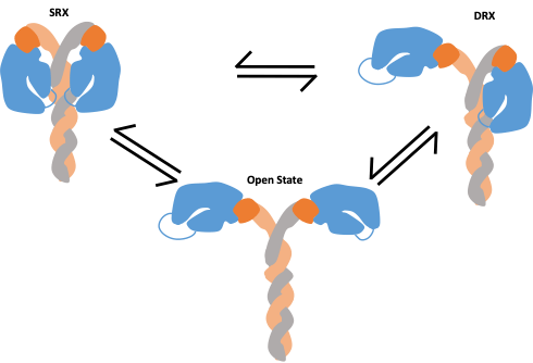 This question ultimately comes down to altered myosin regulation. One such method of regulation is the coordination between the super relaxed state (SRX) and disordered relaxed state (DRX). In SRX, both “heads” of the myosin molecule are blocked from interactions with their actin substrate, while in DRX only a single head is inhibited (Figure 2). When the amount of myosin heads that are able to interact with the actin thin filaments is altered, the overall motor properties of the myosin molecule, and thus contractility, are altered. This is especially true when a mixture of both WT myosin and mutated myosin are within a sarcomere. Interestingly, this balance between SRX and DRX is not modulated via the myosin molecule alone, but various accessory proteins that bind the myosin heavy chain can cause alterations in this process as well (6). Similarly, mutations in these proteins can also lead to HCM and altered cardiac function.