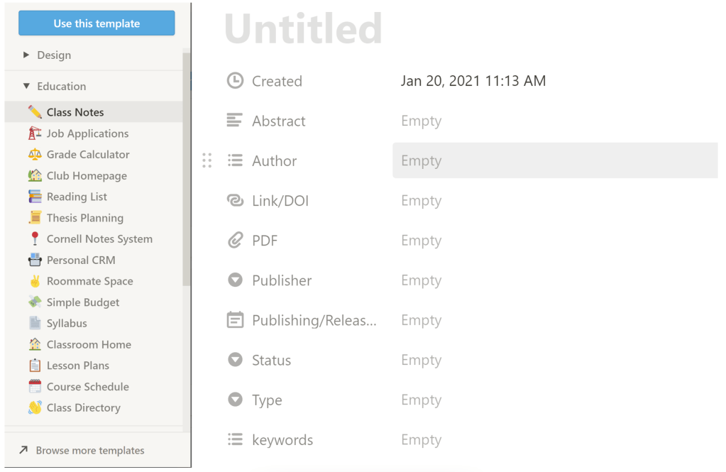 Another wonderful database resource for organizing your scientific literature is Notion. Notion is a useful workspace that can be used for note taking, task management, and also linked databases which are great for organizing all your papers (for more information on using Notion in your PhD, check out Becca Fleeman’s previous LTS article “PhD Project Management Hacking”). Notion has preset templates such as “Class notes”, “Reading List”, and “Thesis Planning”, which allow you to easily organize your notes and to-do list (fig. 2). You can also customize the templates to fit your needs. For example, I created a page template that allows me to gain quick access to basic information about an article (fig 2). A great feature unique to Notion is that you can link to a different paper. For example, if the paper you’re reading cites an article that you have already read, or think will be useful for your research, you can link that paper to your current note page, making it easy to find the link between different papers.