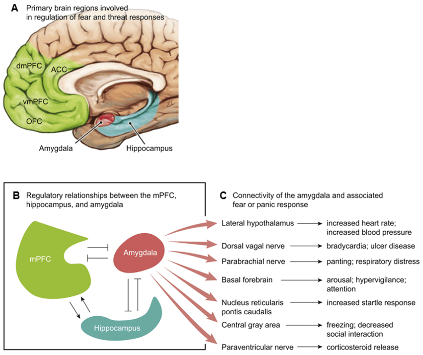 A) Fundamental brain regions for regulating fear and threat responses are the amygdala, hippocampus, and ventromedial prefrontal cortex. B) and C) The medial prefrontal cortex and hippocampus regulate amygdala activity, fear modulation, and context. The ventromedial prefrontal cortex reduces subjective distress when inhibiting amygdala activity. The hippocampus encodes fear memories. Abbreviations: dmPFC (dorsomedial prefrontal cortex), ACC (anterior cingulate cortex), vmPFC (ventromedial prefrontal cortex), OFC (orbitofrontal cortex), mPFC (medial prefrontal cortex). Modified from Ross et al., 2017 (14).
