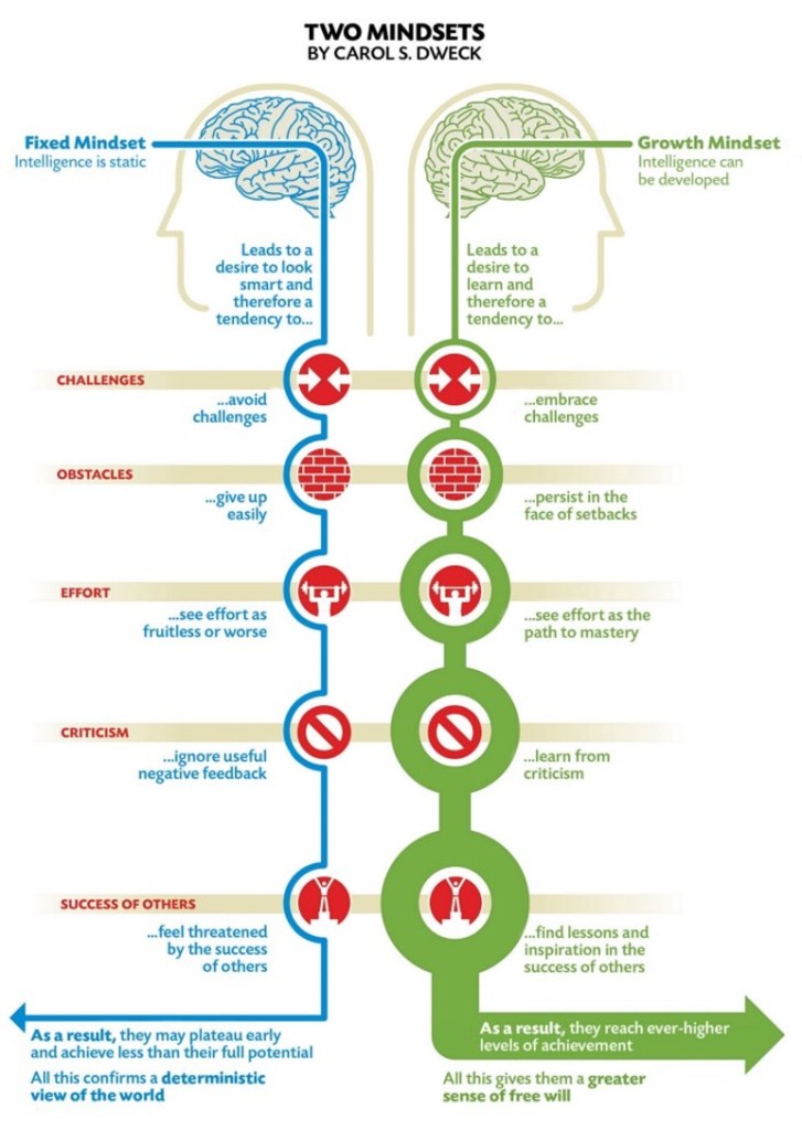 Growth mindset is a phenomenon described initially by Dr. Carol Dweck in the 1980s1. Growth mindset and fixed mindset refer to the way a person views their abilities. If a person sees intelligence and skills as inherent and unchangeable, they are said to have a fixed mindset1. If they believe their skills can be developed and improved through practice and proper teaching, then they have a growth mindset1. For example, a person with a fixed mindset would believe that they are either good at science or bad at science with no way to improve; a person with a growth mindset believes that they are able to improve their scientific skills and ability. Further, a person with a fixed mindset avoids challenges and is concerned about looking foolish or unintelligent; however, a person with a growth mindset welcomes challenges, and is more willing to persevere through obstacles1.