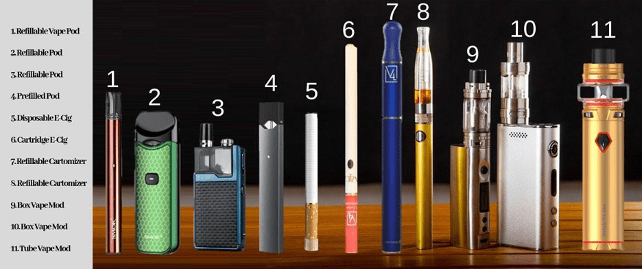 So, what are those funky devices that allow people to smoke at any time without using a lighter? E-cigarettes, also known as e-cigs, vapes, vape pens, JUULs, or electronic nicotine delivery systems (ENDS), are battery-operated devices that, unlike a traditional cigarette, burn a liquid within the device to produce an aerosol inhaled by the user.1 The liquid may contain nicotine, flavorings, or other additives that have become increasingly popular in youth and adults since 2003.3 In 2018, over 8 million adults and 3.6 million US middle and high school students were e-cigarette users.1 This constitutes about 4.9% of middle school students and 20.8% of high school students in the US.1 Reasons for high e-cigarette usage in youth include the sleek designs, fun flavors, ability to hide them easily, and ability to smoke anywhere with the click of a button.[1] E-cigarettes vary in design with some looking similar to cigarettes and pipes, to others resembling USB flash drives, pens, or other ordinary items that youth perceive as cool.4 In the past decade, tobacco companies have developed several e-cigarette products (Figure 1) and marketed e-cigarettes as a safer alternative to smoking. Although e-cigarettes do not contain the 7000+ harmful chemicals that traditional cigarettes do, we do not fully understand the harmful effects of e-cigarettes.1,5