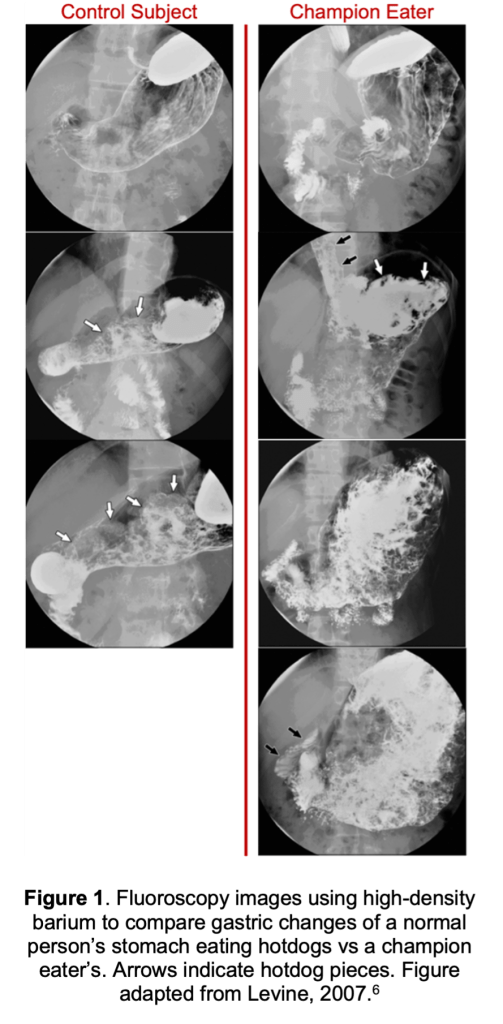 The stomach was one of the first organs to be studied with scientific stomach observations dating back to the 1500s1. The volume of the average empty human stomach is 45-75 mL, yet the stomach can expand during feeding to anywhere from 1.5 liters in lean adults, to 4 liters in those with binge eating disorders2–4. To visualize this, think of a flattened balloon sitting in your abdomen, then consider how big that balloon is when fully blown up! Your stomach can stretch to over five times its size because it is a smooth muscle tube5. Consider Joey Chestnut, who holds over 46 food eating records, including his record of eating 74 Nathan’s Famous hot dogs in 10 minutes. Figure 1 shows how much the human stomach can distend for competitive eaters who practice this stretching6.