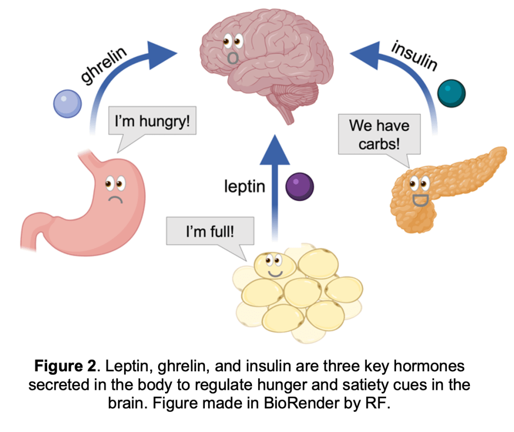 Your hunger and satiety cues are controlled by the hormones ghrelin, leptin, and insulin (Figure 2). When your stomach is empty, it releases ghrelin into your circulation. Ghrelin finds its way to the brain and stimulates neurons in the hypothalamus that tell your brain “I’m hungry!”1,8. Subsequently, as soon as your stomach begins to fill with food, ghrelin stops being secreted and thus ends the appetite stimulus1. Leptin, a hormone secreted from fat cells, aids in ending the appetite stimulus by telling the brain “stop eating, I’m full!”1,8. A third key hormone important in hunger regulation is insulin, which is secreted by the pancreas. When we eat carbohydrates, insulin is released to take the glucose in the blood into the cells. Thus, high insulin levels tell your brain that you have enough food8, while low insulin levels tell your brain “Can I have some more carbs, please?”.