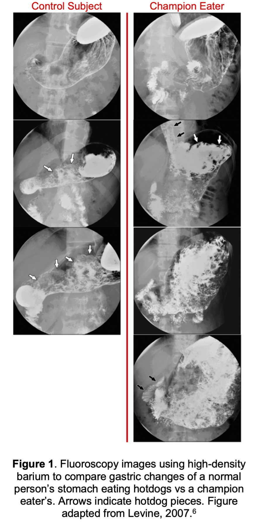 The stomach was one of the first organs to be studied with scientific stomach observations dating back to the 1500s1. The volume of the average empty human stomach is 45-75 mL, yet the stomach can expand during feeding to anywhere from 1.5 liters in lean adults, to 4 liters in those with binge eating disorders2–4. To visualize this, think of a flattened balloon sitting in your abdomen, then consider how big that balloon is when fully blown up! Your stomach can stretch to over five times its size because it is a smooth muscle tube5. Consider Joey Chestnut, who holds over 46 food eating records, including his record of eating 74 Nathan’s Famous hot dogs in 10 minutes. Figure 1 shows how much the human stomach can distend for competitive eaters who practice this stretching6.