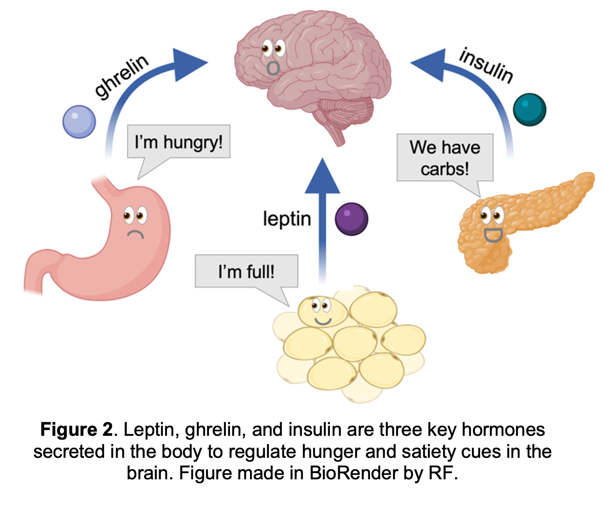 Your hunger and satiety cues are controlled by the hormones ghrelin, leptin, and insulin (Figure 2). When your stomach is empty, it releases ghrelin into your circulation. Ghrelin finds its way to the brain and stimulates neurons in the hypothalamus that tell your brain “I’m hungry!”1,8. Subsequently, as soon as your stomach begins to fill with food, ghrelin stops being secreted and thus ends the appetite stimulus1. Leptin, a hormone secreted from fat cells, aids in ending the appetite stimulus by telling the brain “stop eating, I’m full!”1,8. A third key hormone important in hunger regulation is insulin, which is secreted by the pancreas. When we eat carbohydrates, insulin is released to take the glucose in the blood into the cells. Thus, high insulin levels tell your brain that you have enough food8, while low insulin levels tell your brain “Can I have some more carbs, please?”.