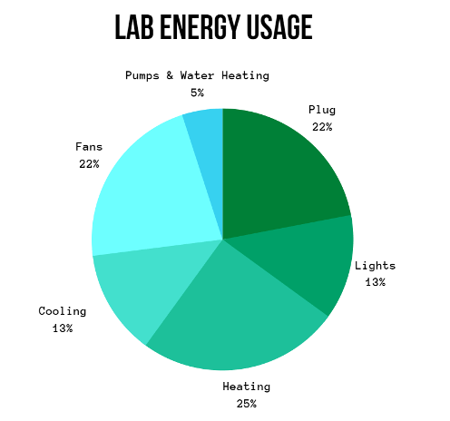 The average lab uses more energy per square foot than a hospital.1 As illustrated in Figure 1, lighting uses about 13% of the energy consumed, and heating, cooling, and ventilation use a whopping 60%, on average.4 The plug load, or the energy pulled in from outlets, accounts for 22% of lab energy use, and is the easiest category on which we can have an impact.4 Let’s analyze this plug load by looking at the usage of some general equipment present in most labs.