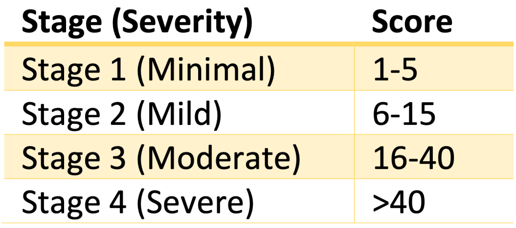 Endometrial tissue in the abdominal cavity can stick to any of the abdominal and pelvic organs, with the most frequent sites being the ovaries, Fallopian tubes, uterosacral ligaments, and the uterus itself (Figure 2).8 EM is staged by a weighted numeric system where the location and severity of adhesions are summed and categorized into four stages (Figure 3).This staging system accounts for deeply infiltrating endometriosis (DIE), where abnormal tissue infiltrates surrounding healthy tissue at least 5mm deep. DIE can occur on the bladder, uterus, uterosacral ligaments, and bowel.10 However, this staging system does not account for the pain associated with the adhesions because staging does not indicate symptom severity, merely the severity of inflammation and adhesion.1