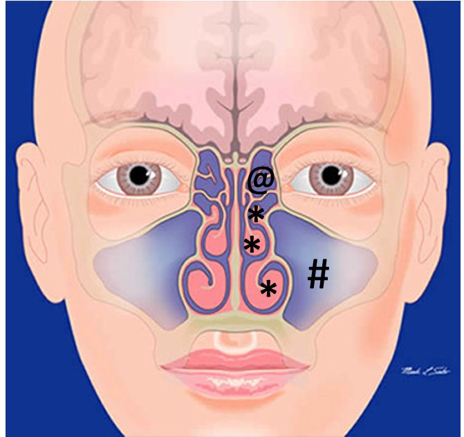 Rather than a direct path from the nostrils to the lungs, the nasal cavity has a labyrinthian structure with all sorts of nooks and crannies that air has to pass through (Fig. 1). In the center, these nooks and crannies are created by bony features called turbinates, of which there are three on each side. In addition to these turbinates, there are several sinuses that all open into the nasal cavity as well (yes, we have giant air-filled pockets inside our skull). These can range from smaller ones like the ethmoid air cells to the vast sinuses like the maxillary sinuses. In addition to aiding in the efficiency of breathing, the sinuses are so large that our voices reverberate inside them and help form everyone’s own distinctive voice. This is why when we are sick and the sinuses and nasal cavity are inflamed, our voices sound different and nasally.