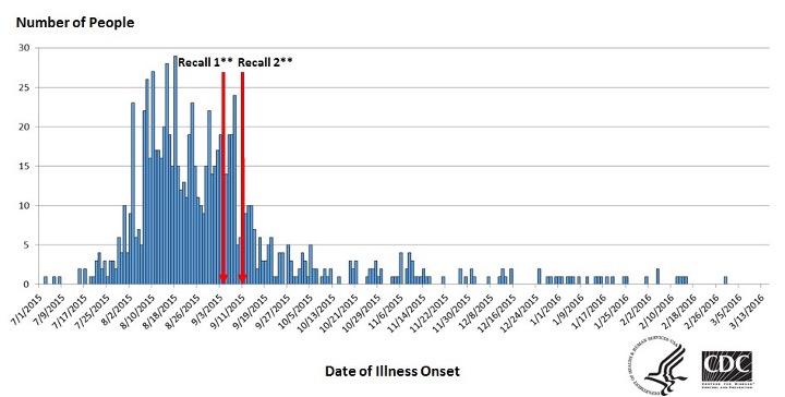 Post-investigation monitoring health agencies observe the incidence of the disease outbreak and determine the appropriate time to consider the outbreak over10. However, in cases where reports of the same microbe continue to arise even after the recall, additional investigations are conducted to determine if other batches of food product are also contaminated, and if a recall needs to be re-issued or expanded to include other lots (Figure 2). Upon seeing a return to a normal level of steady state infections in the population, federal agencies will conclude that the outbreak has ended and consider their investigation over9.