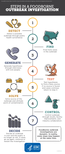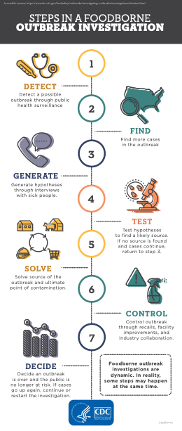 - Centers for Disease Control and Prevention. (2018, June 20). Decide an outbreak is over. Retrieved July 11, 2022, from https://www.cdc.gov/foodsafety/outbreaks/investigating-outbreaks/investigations/decision.html
