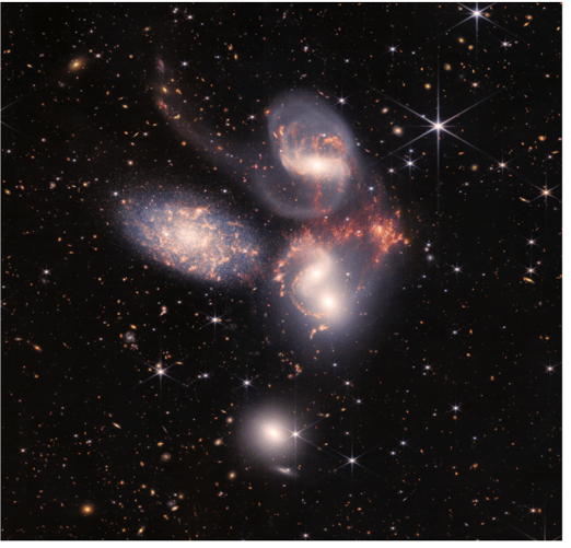 “Stephan’s Quintet19” (Fig. 4): First discovered in 1877 by French astronomer Edouard Stephan, this cluster of five galaxies in the Pegasus constellation was actually depicted in the 1946 film “It’s a Wonderful Life” as embodiments of angels! Here, the JWST shows the galaxies in unprecedented detail, including “shock waves” as one galaxy “smashes through the cluster,” as well as images of the supermassive black hole at the center of the NGC 7319 galaxy. Observing this cluster will help unravel remaining mysteries of galaxy evolution20.