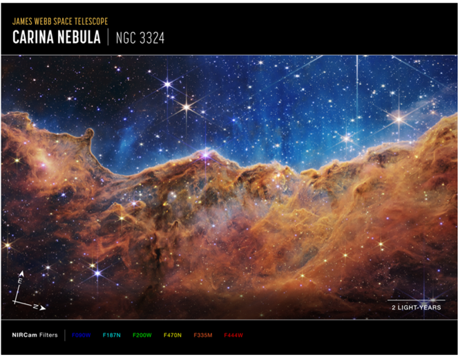 “Cosmic Cliffs” in the Carina Nebula17 (Fig. 3): Imaged here by the JWST’s NIRCam, this landscape-like region of the larger Carina Nebula consists of “cliffs” that extend up to “7 light-years high” from peak to trough. Also pictured are “stellar nurseries,” offering insight into the early stages of star formation, a phenomenon that has been challenging to observe18.