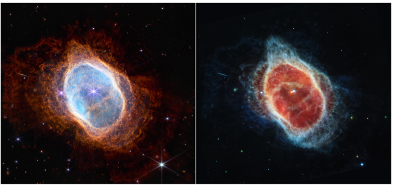 “Southern Ring Nebula21” (Fig. 5): a neighbor to us at mere 25,000 light-years down the cosmic block, the Southern Ring Nebula is a planetary nebula with a two-star system at its heart. These photos, taken by two of the JWST’s infrared imagers, reveal previously-unknown details of the process of star death22.