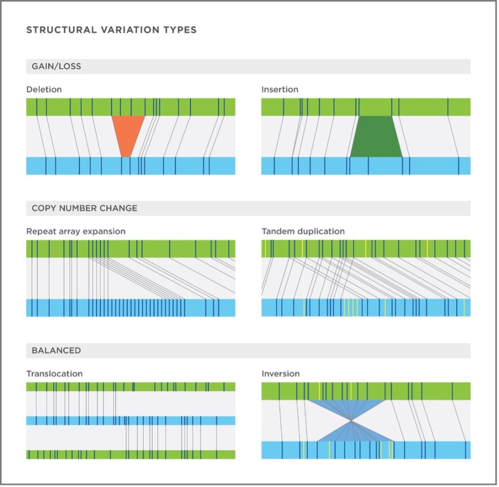 - Bionano optical mapping uses long reads to image DNA and SVs can be physically observed.