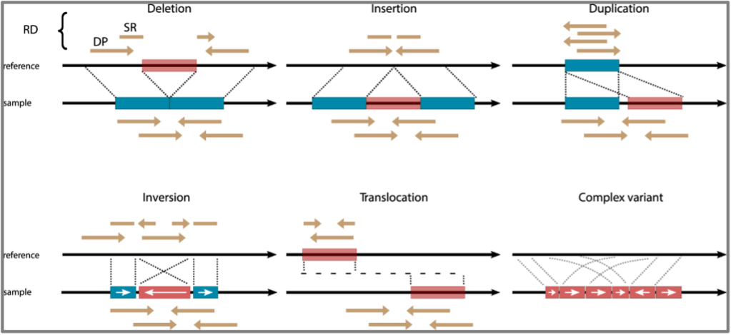 Next-generation short-read sequencing (NGS), which is a high yield sequencing method that can sequence many fragments of DNA at once, has one major disadvantage. We cannot actually see an SV; we can only use SV calling algorithms, such as LUMPY, to predict that it might be occurring1,6. Predictions of SVs are made when a patient’s genome does not align exactly to the reference genome at a particular site in the DNA. Unlike karyotyping, which focuses on very large SVs (typically over 10-20mb in length), the short reads of NGS are limited in that they cannot cover large repetitive regions or large insertions with accuracy7.