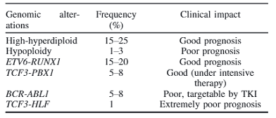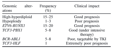 Table 1: Genomic alterations and their clinical impact in pediatric acute lymphoblastic leukemia. Table reproduced from Kato, et al., Pediatr Int. 2018