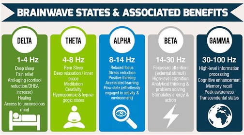 Studies have indicated that binaural beats affect cognitive functions, including improved memory and attention.2,6,7 In addition, these beats have also been implicated in reducing anxiety levels and lowering pain perception8,9. These studies utilize electroencephalography (EEG), which involves using electrodes to detect electrical signals from the brain, to measure brain responses to different sound frequencies.10 Research has found that specific frequencies do elicit different cognitive responses.6 Delta frequencies, which range from 1-4 Hz, are associated with deeper sleep and relaxation, theta frequencies, which range from 4-8 Hz, are associated with REM sleep, reduced anxiety, and increased meditative and creative states, alpha frequency, which range from 8-13 Hz, are associated with increased positivity and reduced stress, and beta frequencies, which range from 14-30 Hz, are associated with increased concentration, alertness, problem-solving, and improved memory (Figure 4).11