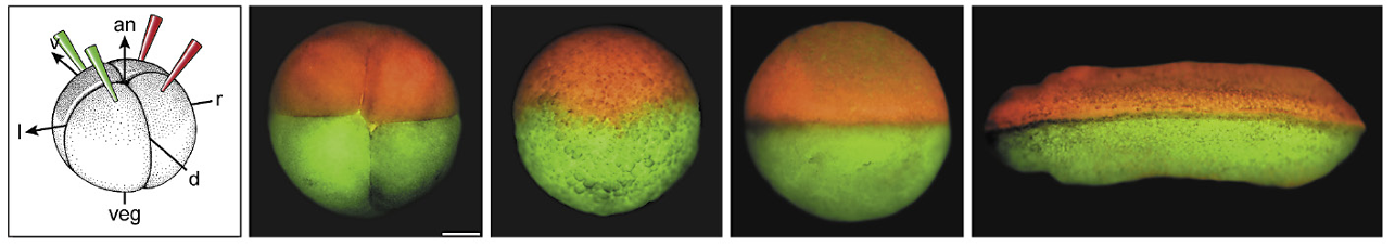 Beyond their role as early pregnancy indicators and use in hormone studies, African clawed frogs have also played crucial roles in research in the field of development and physiology. Development stages occurring during the first 1-2 days of frog embryonic growth would take weeks to achieve in a mouse model. The further value of using Xenopus in developmental studies can be attributed to their embryos being large and easy to microinject. The embryos also remain consistent in size as early development progresses, preventing the dilution of experimental substances as the frog increases in mass. During experiments, nucleic acids, proteins, and whole nuclei and organelles can be easily injected into either the whole frog embryo or specific cells. Cell-free extractions can also be easily removed from immature egg cells to perform in vitro biochemistry and molecular biology. After the first cellular cleavage, the midline of the frog forms where the body is divided in half and separates, allowing for one side to be injected with a mutated gene or pharmaceutical while leaving the other side unaltered (Figure 2).6 With these one-sided injections, a single frog can have both the control and experimental in the same organism, decreasing variability.6 Furthermore, Xenopus embryos can tolerate dramatic manipulations such as transplantation of single cells and ‘cut and paste’ of different larger sections of the embryo.3 ‘Windows’ have even been made within living embryos where the outer section of the embryo is removed to allow for live imaging of the kidneys as they develop over time.7
