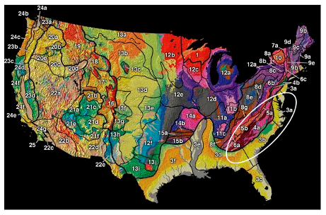 To make sense of the ground we stand on, geologists divide the earth into physiographic regions, provinces, and sections, a hierarchy based on geologic similarity.[1] For example, all areas in Figure 2 labeled with a number 4-10are part of the Appalachian Mountain Region, but 4 and 5 are different provinces within the region. Areas with shared geologic history have often been exposed to similar environments (and thus display similar features), so this becomes a useful tool for comparing large swaths of land.[2] The two provinces relevant to our discussion are the Piedmont (4a in Figure 2) and the Atlantic Coastal Plain (3a-f in Figure 2).