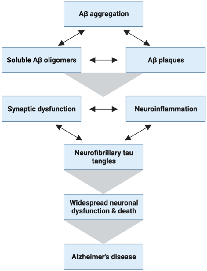While not fully understood, the pathogenesis of AD has been highly studied and involves the development of the hallmark protein pathologies (proteinopathies) amyloid β (Aβ) plaques and neurofibrillary tau tangles. These two proteinopathies, while once only detectable postmortem, can now be reliably detected using brain imaging techniques (and blood-based biomarkers for these pathologies are close to approval, see my previous LTS article!). Since Aβ deposition precedes both tau pathology and cognitive decline seen in AD, a large portion of the field has focused on this Amyloid Cascade Hypothesis (Figure 2). Both of the recently approved AD therapeutics (non-curative) are based on this hypothesis and target Aβ2–6. Besides these key pathologies, several genetic risk factors have also been evaluated for their impact on AD.