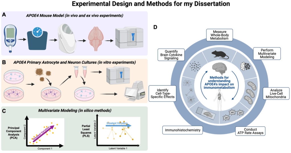 During my PhD, I used murine in vivo, ex vivo, and in vitro methods (live mouse experiments, postmortem mouse experiments, and cell culture experiments), followed by multivariate modeling to better understand relationships between immune signaling and metabolic function (Figure 3A-C). I measured several peripheral metabolic factors in mice carrying either humanized APOE3 or APOE4 alleles, then quantified the immune signaling in their brain (Figure 3A). Using multivariate modeling, I compared the effects of APOE genotype, sex, and age on these measurements, as well as connected the changes in immune signaling to changes in metabolism (Figure 3C).