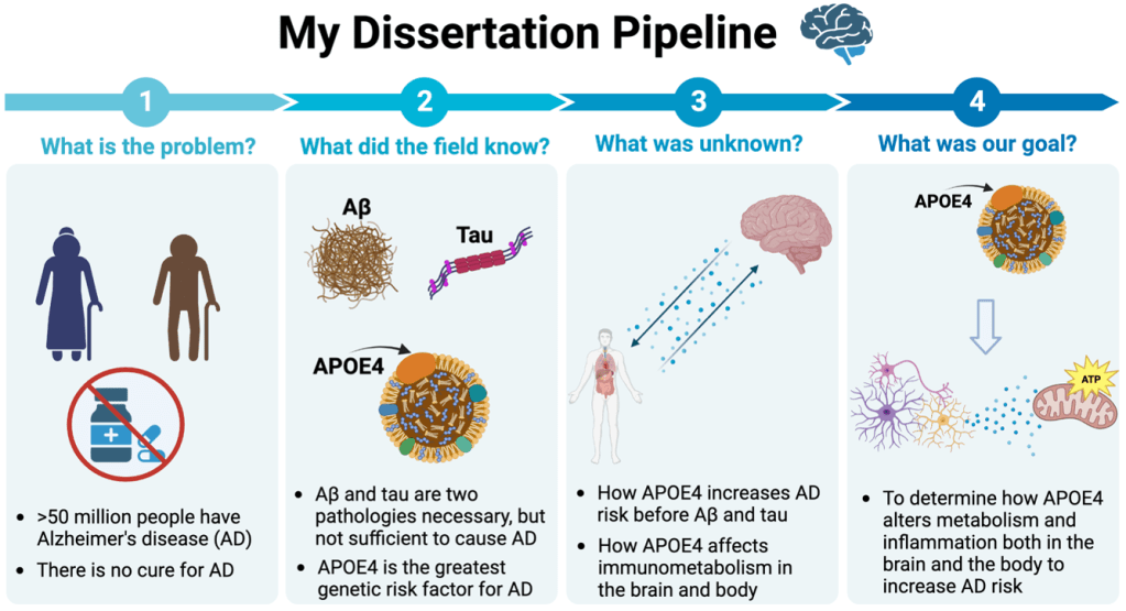 The following is a synopsis of my PhD thesis that I defended on January 19, 2023, titled Alzheimer’s Disease Risk Conveyed by Apolipoprotein E ε4: Immunometabolism and the Brain-Body Connection. Thank you to LTS for the opportunity to share my PhD findings in a unique way to reach more people!