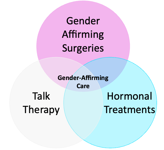 Many forms of gender-affirming care exist for people wanting to address their gender dysphoria (Figure 1). Some people may elect to undergo gender-affirming surgical procedures, like top surgery, to have their physical bodies match their gender identity. Others may take hormonal treatments with estrogen or testosterone to change their bodies more subtly to match their gender identity, such as with voice changes or hair growth. Trans folks can also attend therapy to cognitively address their gender dysphoria.