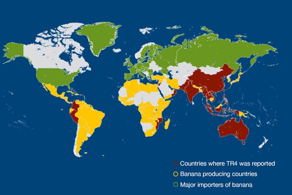 TR4 infections were first identified in Taiwan in the 1960s and quickly spread, becoming a much more serious issue than expected (Figure 1). By the 1990s, TR4 infections jumped continents, appearing in East Africa and Australia, and in 2019 were found in Latin America. The fungus can linger in the soil for 30 years, ruining plantation land and preventing new trees from being planted to replace the ones lost to infection. Although the fact that Cavendish bananas are all clones seemed like a blessing to early farmers, it has now become a curse. Once one tree is infected with TR4, it easily spreads through the entire plantation because all trees are equally susceptible to infection due to their identical genetics. Because of this unique susceptibility, and how widely TR4 has already spread, researchers believe Cavendish bananas could become extinct in the next several decades.