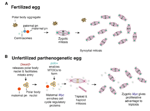 Looking at the function of the mutations in the parthenogenic flies gave some insight to the necessary biological conditions for facultative parthenogenesis. Manipulation of the Desat2 and polo genes promotes structural integrity of the zygote throughout cell divisions. The Myc gene promotes more cell division, giving the early zygote a necessary growth advantage for survival. These three genes that were either mutated or inserted into D. melanogaster were sufficient for the flies to utilize facultative parthenogenesis. The function of these genes during the parthenogenetic process is not fully understood, and more research needs to be conducted. Further research into parthenogenesis would lead to better understanding of its natural development; however, the basis of this research produced a current model of parthenogenesis (Figure 3). This model lays the foundation for future work in understanding the process of parthenogenesis.