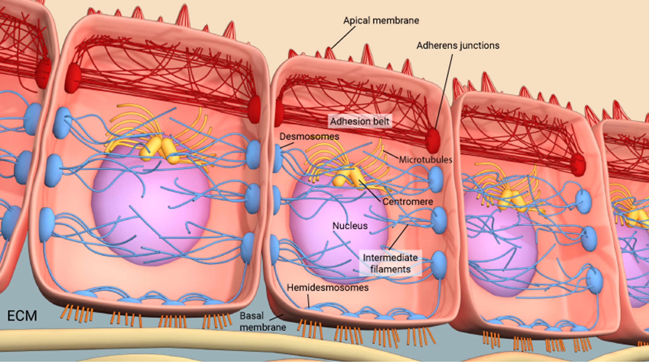 The skin, or the epidermis, is the largest organ in your body, but have you ever thought about the structural components that allow your skin to stay intact? Cell-cell junctions are critical for maintaining the integrity of the epidermis, which protects your body from dehydration and external elements such as infection, physical stress, and extreme temperatures. Desmosomes are one type of cell junction that connect the cytoskeleton to sites of cell-cell contact, providing the cell with structure and support much like a scaffold does at a construction site1 (Figure 1). Desmosomes maintain adhesion between cells, helping to keep certain tissues from breaking apart. Maintaining this adhesion is especially important in tissues like the skin and the heart, which experience significant mechanical stresses. Think about the stretching and compression of the skin during everyday activities and the constant beating of the heart2.