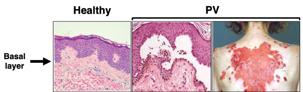 Due to their role in cell-cell adhesion and structural support, disruption of desmosomes leads to tissue fragility, and is the hallmark of various skin diseases like pemphigus vulgaris (PV). PV is an autoimmune skin blistering disease where patients produce antibodies that attack proteins in their own body, known as autoantibodies (IgG). In the case of PV, patients produce antibodies that attack desmoglein 3 (Dsg3), a protein necessary for desmosomal adhesion3. When PV patient IgG attacks Dsg3, it causes desmosome disruption and loss of adhesion between keratinocytes (a type of skin cell) in the deepest layer of the epidermis, termed the basal layer3. Clinically, PV patients present with painful blisters and erosions on the skin and mucosal surfaces like the mouth4,5 (Figure 2). While it is well-established that these autoantibodies against Dsg3 are the cause of PV, researchers still do not fully understand the cellular signaling mechanisms that lead to loss of cell-cell adhesion in this disease4.