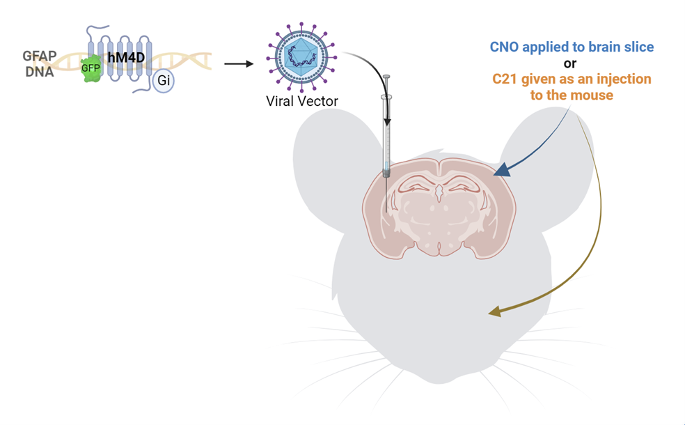 When I repeated the recordings, pretreating the slices with astrocyte inhibitor before applying alcohol, I found that there was no increase in the excitatory activity of the cells in response to alcohol. In contrast, there was still an increase in the activity of the cells treated with the microglia inhibitor. This finding led us to believe that alcohol’s excitatory effect on central amygdala cells was mediated by astrocytes, not microglia. To be rigorous, we wanted to inhibit astrocytes in a different way and see if we could replicate these results. We used a chemogenetic method involving a viral injection of a designer receptor that is exclusively activated by a designer drug (DREADD), in this case clozapine-N-oxide (CNO) (Figure 2). This receptor was an inhibitory receptor specific to astrocytes. Therefore, when this receptor was activated by CNO, astrocytes were inhibited. So, we repeated our previous experiment, but instead of pretreating the slices with fluorocitrate, we pretreated the slices with CNO, effectively inhibiting the astrocytes. When we applied alcohol to the slices, we found the exact same result as before, confirming that astrocytes are needed for alcohol to increase excitatory activity in central amygdala cells. This was an exciting finding, but what does this finding mean in terms of behavior?