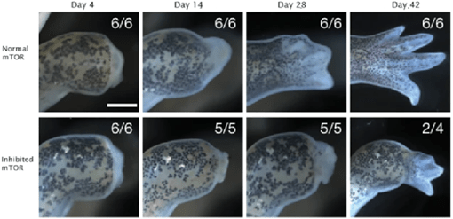 In axolotls, mTOR signaling is needed for initial wound closure and throughout the wound healing process to sustain blastema formation. Following amputation, mTOR shows increased protein production in response to injury, indicating mTOR’s direct involvement in the healing responses. Furthermore, when mTOR is inhibited in injured axolotls, a direct negative effect on the healing process is noticed, resulting in defective limb regeneration, especially during the early stages of healing (Fig. 4).