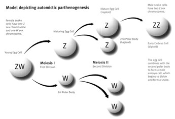 We’re familiar with chromosomes and know that in most mammalian species, including humans, the sex chromosomes are X and Y: biological females have 2 X chromosomes and biological males have an X and a Y chromosome. However, many species of birds, reptiles, fish, and insects use the ZW sex-determination system in which ZW individuals are female, ZZ individuals are male, and WW individuals are usually nonviable. A female Komodo dragon with ZW sex chromosomes can mate with a male dragon (ZZ) to produce female (ZW) or male (ZZ) offspring. Alternatively, if a female Komodo dragon finds herself isolated from males (quite possible in her native island chain habitat, or, say, while in captivity), she can undergo parthenogenesis, duplicating one set of her maternal chromosomes to produce only ZZ sons. Parthenogenesis occurs in a mature oocyte (egg cell) after it’s been separated from a polar body in meiosis, the process of sex cell division (Figure 2). During meiosis, an oocyte with two sets of chromosomes (diploid) splits to form a maturing oocyte and polar body, each with only one set of chromosomes (haploid). Polar bodies are meiotic “by-product” cells that don’t normally contribute to zygote (fertilized egg) formation – in human reproduction, the zygote is formed by the fusion of egg and sperm. However, in the case of automictic parthenogenesis in Komodo dragons, the polar body fuses with the mature oocyte in a process aptly named terminal fusion, leading to a diploid zygote – no sperm necessary!