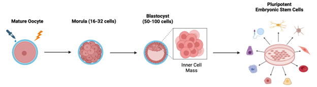 Human stem cell harvesting has long been an ethical battleground based on concerns with exploiting human embryos and defining life and personhood. These concerns arose because, historically, most embryonic stem cells used in research were left over from in vitro fertilizations, or more rarely, from abortions.4 Parthenogenetic embryos don’t circumvent all these concerns, but they do have the advantage of not requiring fertilization. To create a parthenogenetic embryo, oocytes are chemically, electrically, or mechanically stimulated in vitro to encourage cell division (Figure 4).5,6 With the right experimental conditions, oocytes can divide up to the blastocyst stage wherein the embryo consists of 50-100 cells. The blastocyst’s inner cell mass is then harvested, yielding pluripotent embryonic stem cells (ESCs). ESCs can differentiate into cells and tissues of all three germ layers that make up organs. Therefore, they are of great value in regenerative medicine.