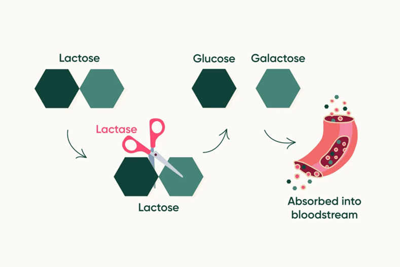 As children, we are told to drink milk to develop strong bones. However, approximately 70% of the global population are lactose intolerant, which means they lack the ability to digest lactose in milk-containing dairy products.1 Lactose is the predominant carbohydrate, or sugar, found in milk, as well as its main energy source. Upon digestion, lactose is broken down by b-galactosidase, an enzyme more commonly known as lactase, which is exclusively made in the small intestine.3 Lactase breaks down lactose into its component sugars, glucose and galactose, which are absorbed into the intestine and bloodstream, circulated throughout the body, and used for energy (Figure 1). The inability of individuals with lactose intolerance to digest and absorb lactose leads to a myriad of gastrointestinal complications such as increased gas, bloating, stomach pain, and diarrhea.