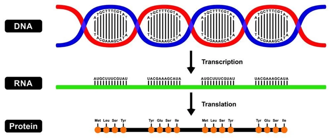 Before diving into the genetics behind LP, it is important to revisit the central dogma of biology (Figure 2). The central dogma explains how genetic information is used to make proteins. First, DNA, which is made up of individual molecules called nucleotides, is copied into RNA through a process called transcription. Then, RNA is used to make proteins during translation. This process is illustrated by the lactase-producing gene LCT, which provides molecular instructions for making the lactase protein.7 However, sometimes there are changes in the nucleotide sequence of DNA that have downstream effects on the proteins that are made.