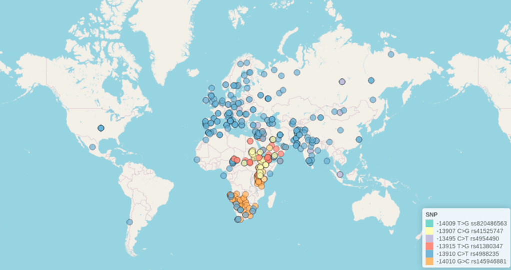 Single nucleotide polymorphisms (SNPs) describe specific changes, or mutations, in the DNA sequence. SNPs occur when one of the four nucleotide bases in a DNA sequence is changed to another base. As of 2024, up to 23 different SNPs in the LCT gene have been documented in specific cultural populations across the globe, indicating that there are significant genetic mechanisms underlying the ability to digest lactose (Figure 3).1
