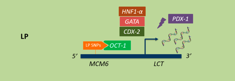 Research shows that depending on where SNPs occur within the LCT gene, the expression, or production of lactase changes drastically. This includes LP, which is caused when there are SNPs close to LCT. Different combinations of these SNPs increase LCT expression by creating more favorable binding sites for transcription factors.1,8 Transcription factors are proteins that bind to specific regions of a DNA sequence to make sure gene expression is turned on or off at the appropriate time. Some transcription factors that alter LCT expression include OCT-1, HNF1-a, GATA, and CDX-1 (Figure 4). When specific SNPs are present, transcription factors, including OCT-1 shown below, bind more readily to the area of DNA that regulates LCT, MCM6, increasing LCT expression. 7,9