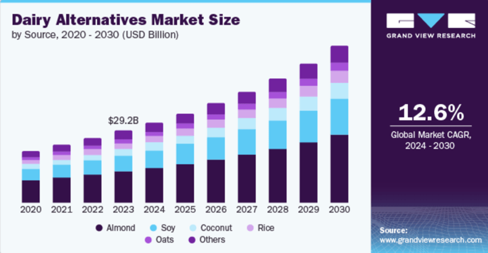 Other popular options for the lactose intolerant community include dairy-free, plant-based products. Dairy lovers and aficionados may also choose from a variety of plant/nut-based milks such as oat, almond, coconut, walnut, cashew, and macadamia that can be found in dairy-free cheeses, yogurts, milks, creams, and butters alike. However, one caveat is trying to find new lactose- or dairy-free products that taste delicious and provide similar nutritional value as some traditional lactose-containing dairy products. Fortunately, increased awareness surrounding special dietary needs has caused the consumer demand for lactose- and dairy-free products to skyrocket, and the global dairy alternative market is expected to increase by approximately 12.6% over the next few years (Figure 5). This means that you will not have to sacrifice your love of dairy products if you are lactose intolerant!