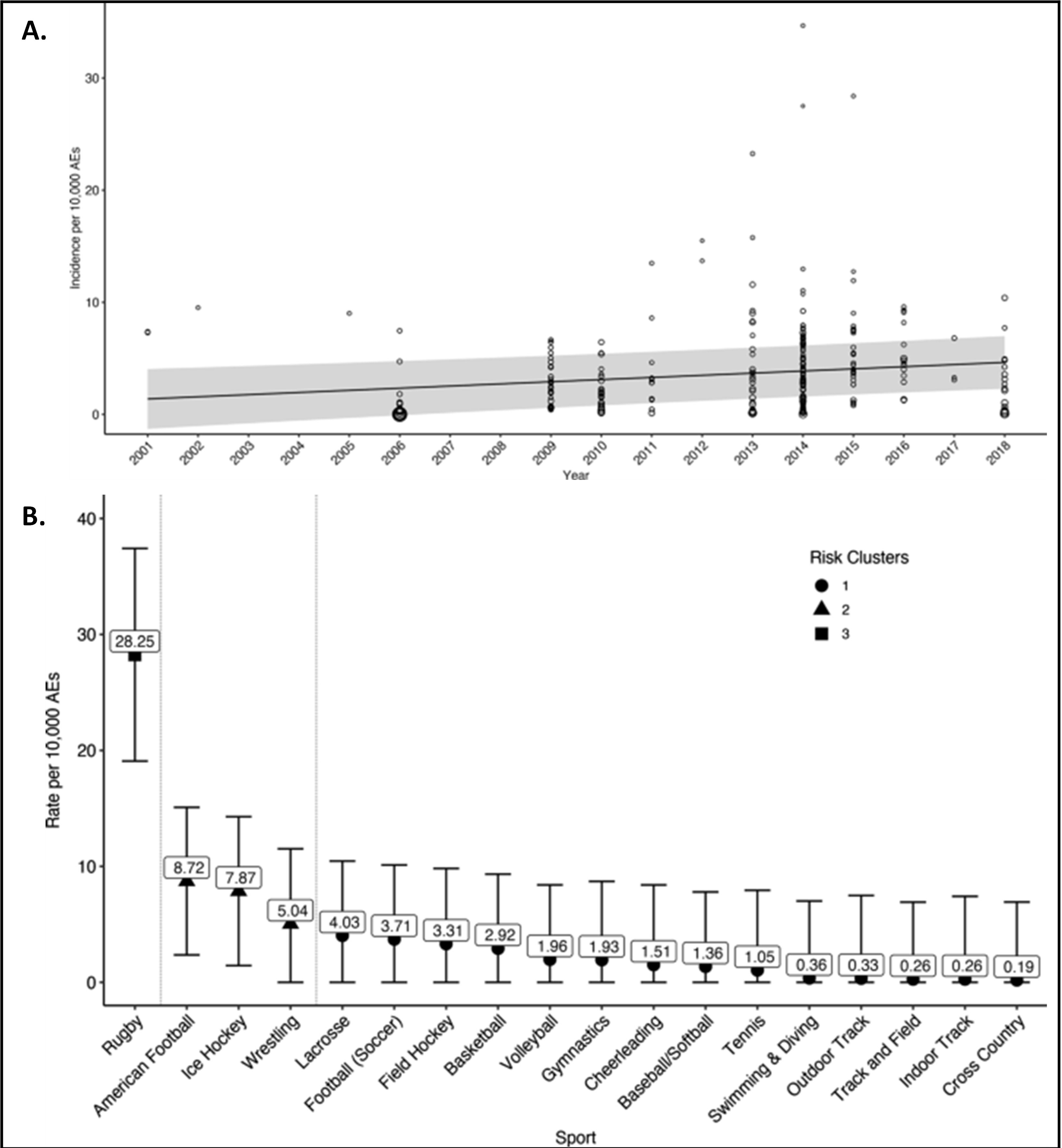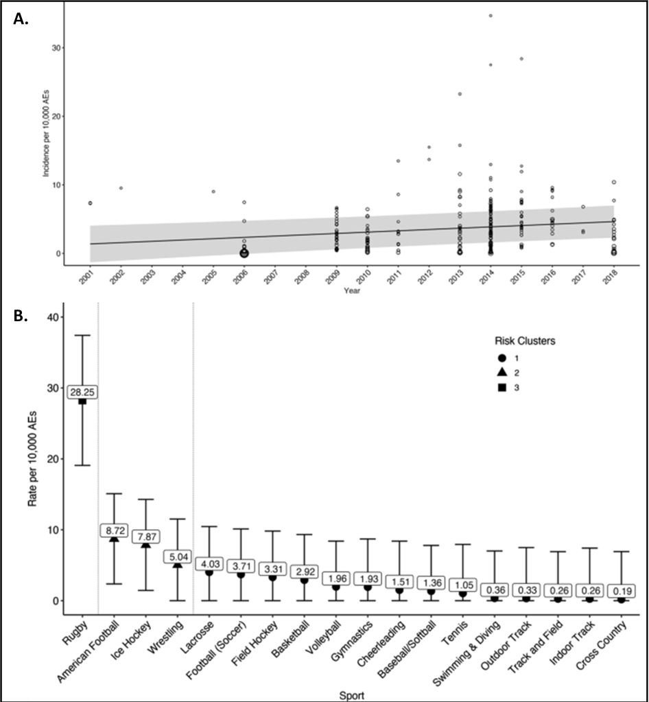 The incidence of concussion diagnoses has risen over the last 20 years (Fig. 1A)2. This increase is most likely due to an increase in awareness of concussions, rather than an actual increase in concussion rate. A recent study performed on high school and collegiate level athletes identified areas of need and the populations most at risk for mTBIs. This study identified the risk of concussion for any athletic event (AE), including games and practices, in 18 of the most popular sports. The top five sports that presented the highest risk for concussion were rugby (28.25 per 10,000 AE), American football (8.72 per 10,000 AE), ice hockey (7.87 per 10,000 AE), wrestling (5.04 per 10,000 AE), and lacrosse (4.03 per 10,000 AE) (Fig. 1B)2. These sports are associated with the highest incidence of concussion because they involve more physical contact between athletes. Rugby carries a much larger risk of concussion compared to all other sports studied, likely because there is no enforcement for helmets or headgear for this sport.