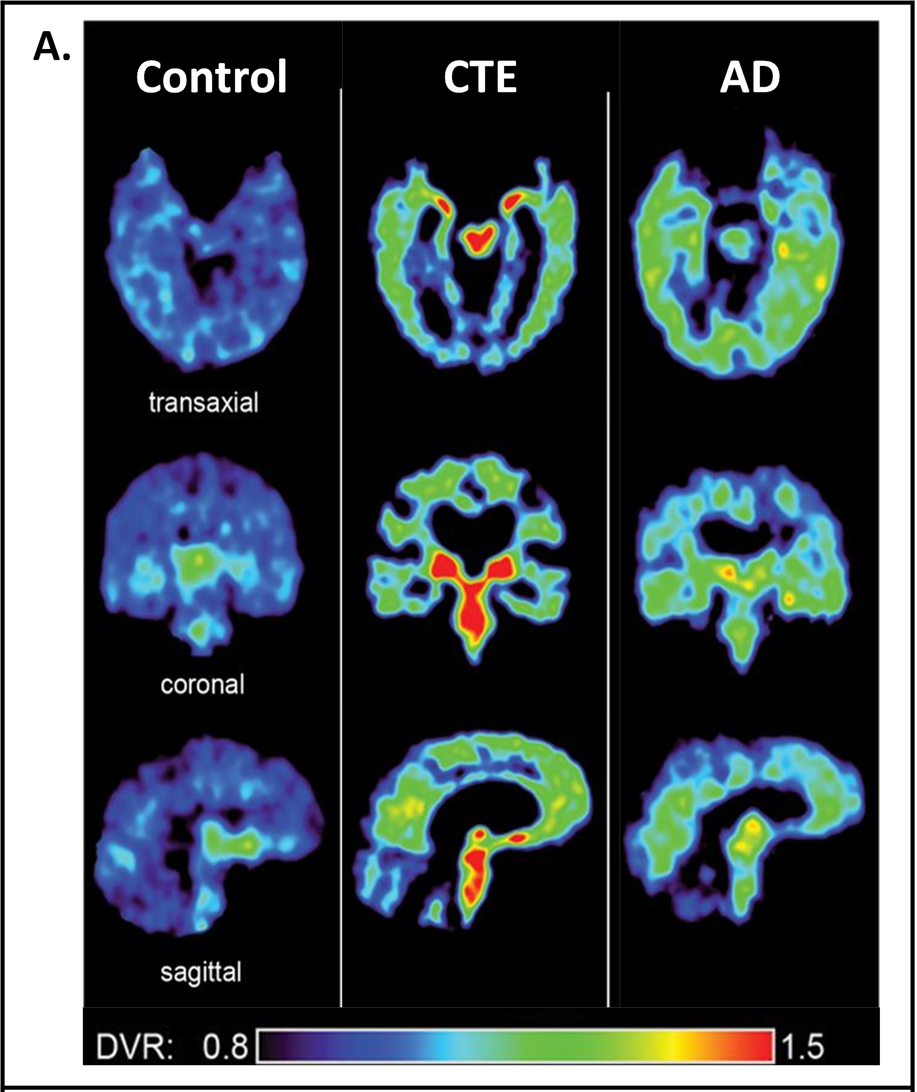 Chronic traumatic encephalopathy (CTE) is a disease linked to repetitive brain trauma and an accumulation of numerous mTBIs. CTE was first identified postmortem in American football players but has since been diagnosed postmortem in amateur athletes as well. CTE pathology involves phosphorylated tau proteins aggregating around blood vessels, astrocytes (glial cells that support neurons), and cortical gray matter in the brain3,4. Tau is a protein that stabilizes microtubules, which are cytoskeletal proteins that contribute to structural integrity and communication between neurons. When tau is overly phosphorylated (addition of a phosphate group to the molecule causing changes to its function), it no longer binds to microtubules in the neurons, leading to the destabilization and eventual death of neurons5. Phosphorylated tau is implicated in other brain diseases like Alzheimer’s disease and is hypothesized to be a cause of neurodegeneration. Interestingly, the pattern of phosphorylated tau observed in CTE is distinct from that of Alzheimer’s disease, suggesting that CTE has a different etiology (Fig. 2)6. CTE is associated with a range of symptoms, the most common being extreme changes in mood (depression and hopelessness), behavior (extreme impulsiveness and physical/verbal violence), cognitive decline, and impaired motor abilities like gait7.