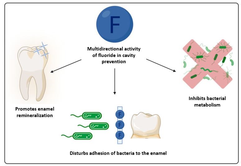 The fluoridation of drinking water aims to prevent tooth decay and cavities. Tooth decay occurs when bacteria consume sugar and produce acid, ultimately leading to the breakdown of teeth over time. Fluoride combats tooth decay in a dual approach by acting upon teeth and the bacteria themselves (Figure 2). Fluoride tends to accumulate in areas high in calcium, such as teeth and bones, and helps remineralize the enamel, thus strengthening teeth and potentially reversing early tooth decay. Fluoride disrupts essential metabolic processes, ultimately leading to bacterial death, by binding and inhibiting certain bacterial enzymes (proteins that accelerate the speed of reactions). Moreover, weak acids, such as hydrogen fluoride, acidify bacterial cells and inhibit pH sensitive metabolic processes3.