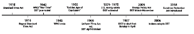 It is a myth that DST was created to improve working conditions for farmers. DST was established in 1918 through the Standard Time Act, which, in addition to creating the major US time zones, introduced DST to save on cost of energy during World War I. After World War I, DST was abolished in the United States. DST was reestablished during World War II where it was referred to as “War Time” (Figure 2). The US government again abolished DST in favor of year-round ST following the end of World War II, but this time change was not well enforced.