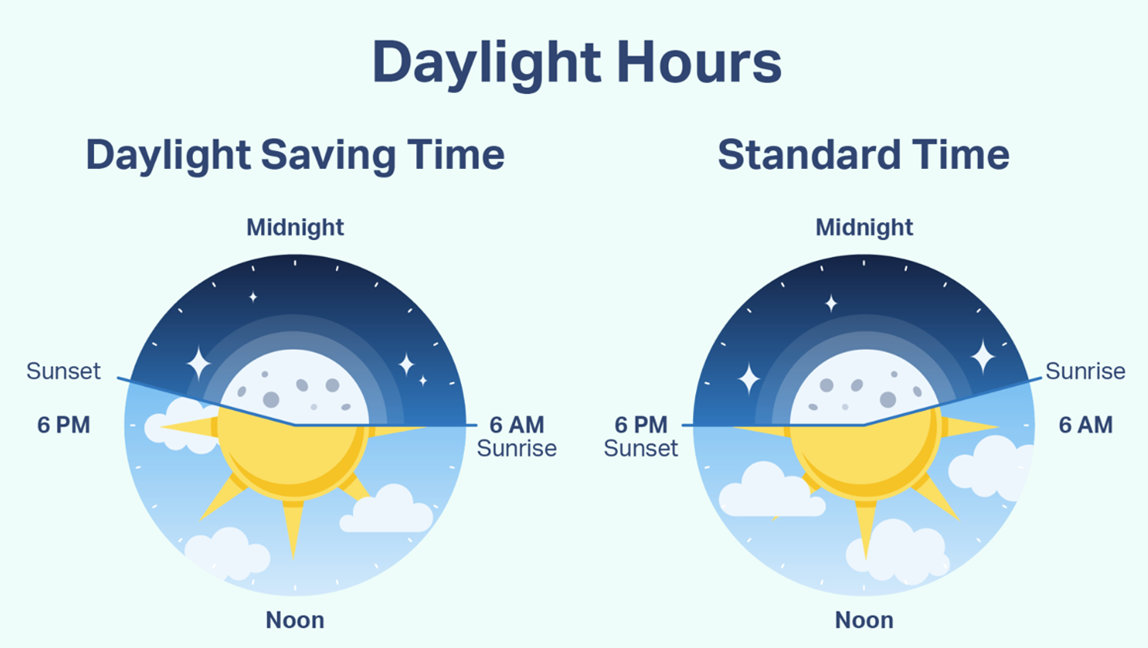 Daylight Saving Time (DST) is the period from March to November where most of the United States turns the clocks forward one hour ahead of Standard Time (ST). During DST, there is more sunlight available during the evening hours (Figure 1). “Springing forward” is thought to align waking time with sunrise during the brightest months of the year and helps us to maximize sunlight throughout the day. But is changing the clocks twice a year more of a burden than a benefit?