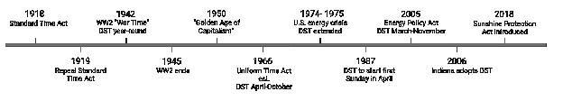 It is a myth that DST was created to improve working conditions for farmers. DST was established in 1918 through the Standard Time Act, which, in addition to creating the major US time zones, introduced DST to save on cost of energy during World War I. After World War I, DST was abolished in the United States. DST was reestablished during World War II where it was referred to as “War Time” (Figure 2). The US government again abolished DST in favor of year-round ST following the end of World War II, but this time change was not well enforced.