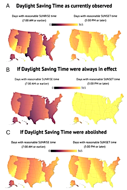 In recent years, the Sunshine Protection Act (Figure 2) has been introduced to the Senate to override the Uniform Time Act make DST permanent, abolishing ST. This would impact sunrise and sunset times throughout the year, such that in permanent DST people would wake up in darkness for most of the year but have more sunlight in the evening (Figure 3B). According to a CBS News Poll, 46% of Americans would support the change to DST year-round. But experts are concerned about the potential long-term consequences of permanent DST on public health.