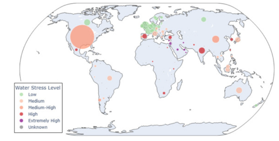 Nearly half of the data centers in the United States are located in water-stressed regions (Figure 3), stressed even further by the indirect uses of water. Worse, only 51% of data centers track their water usage. This translates to a major lack of transparency from companies to the consumers about the irreversible consumption of a shared crucial resource.