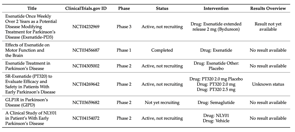 14. McFarthing, K., Larson, D. & Simuni, T. Clinical Trial Highlights – GLP-1 agonists. J. Park. Dis. 10, 355–368 (2020).
