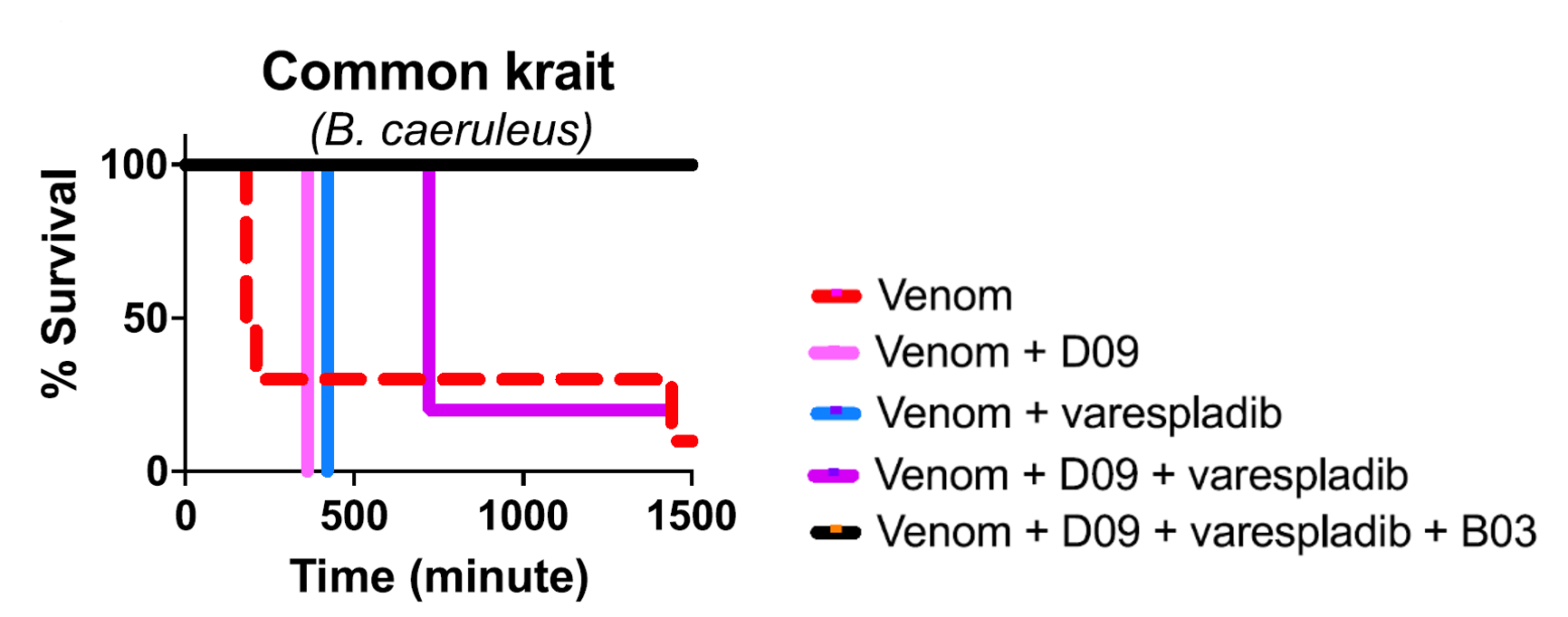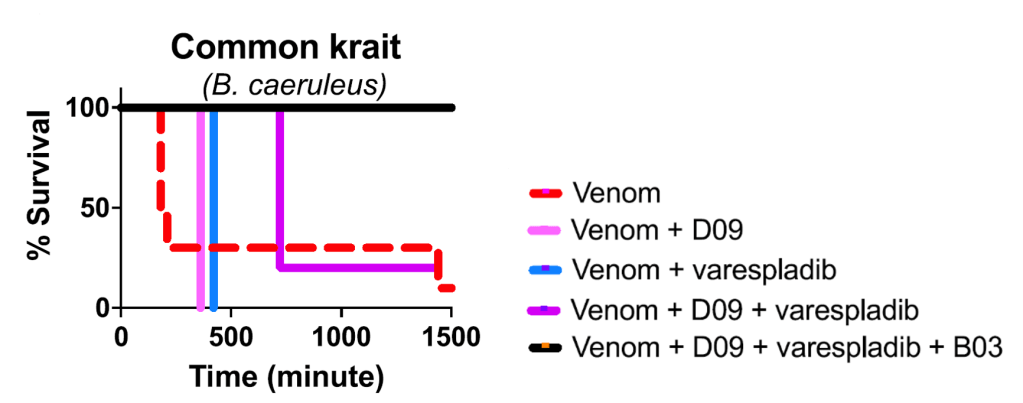 Friede’s plasma also yielded a second neutralizing antibody that targeted SNXs, which they called SNX-B03. After some preliminary investigation of the antibody, Glanville and colleagues added SNX-B03 to the LNX-D09 and varespladib mixture. They hypothesized that the resulting cocktail, which targets three common venom toxins, should be effective against a wide range of Elapidae species. The cocktail was tested in vivo by injecting mice with a venom-cocktail mixture in controlled doses. Although common krait venom, which is composed of 64.5% PLA2 and 19% 3FTX, typically induces death in mice as early as 3 hours, adding either LNXD09 or varespladib increased survival time to 6 and 7 hours. Utilizing the three-part cocktail (containing SNX-B03, LNX-D09, and varespladib) fully protected (in other words: they lived!) the mice from common krait venom (Figure 2).